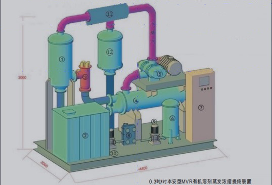 設(shè)備組成: 1、分離室;2、有機(jī)溶劑箱;3、啟動(dòng)蒸汽發(fā)生器; 4、水平管降膜蒸發(fā)器;5、壓縮機(jī);6、冷凝水罐; 7、PLC電控柜;8、板式換熱器;9、冷凝水泵; 10、原料泵;11、能量轉(zhuǎn)化器;12、提純?nèi)軇┕蕖?nbsp;